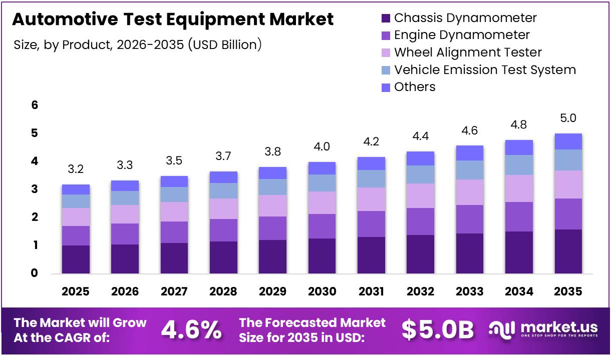 The Global Automotive Test Equipment Market size is expected to be worth around USD 5.0 Billion by 2035 from USD 3.2 Billion in 2025, growing at a CAGR of 4.6% during the forecast period 2026 to 2035.
