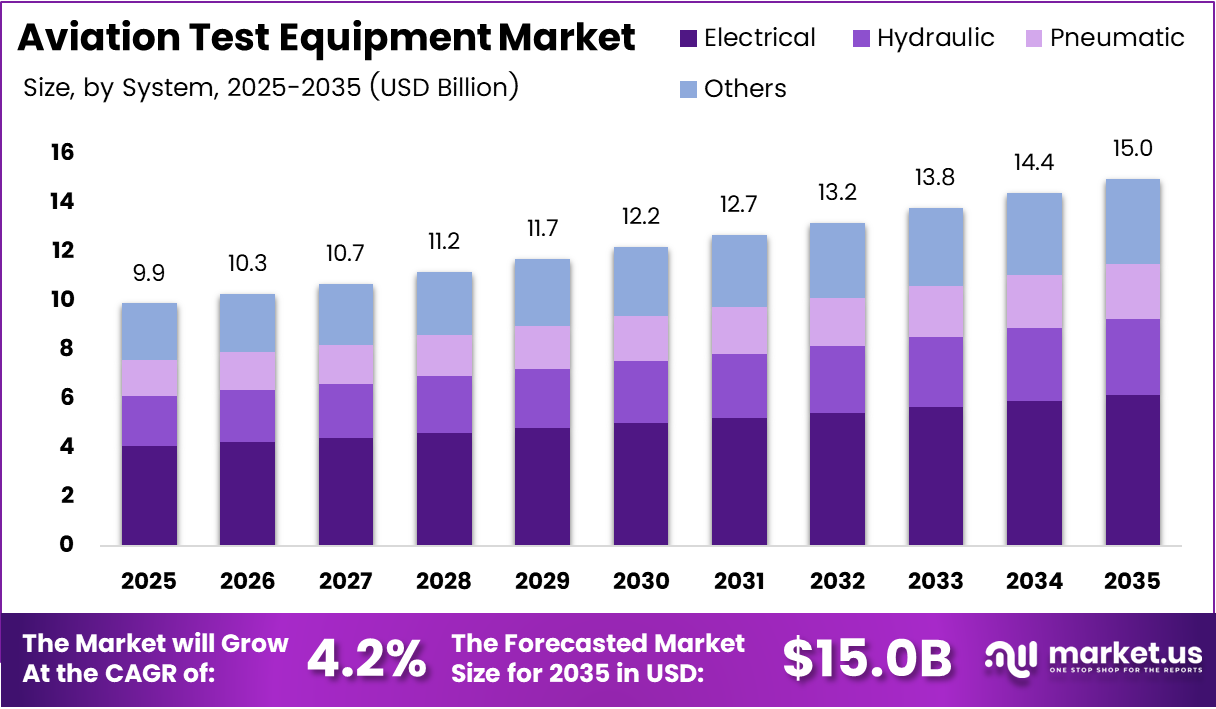 Global Aviation Test Equipment Market size is expected to be worth around USD 15.0 Billion by 2035 from USD 9.9 Billion in 2025, growing at a CAGR of 4.2% during the forecast period 2026 to 2035.