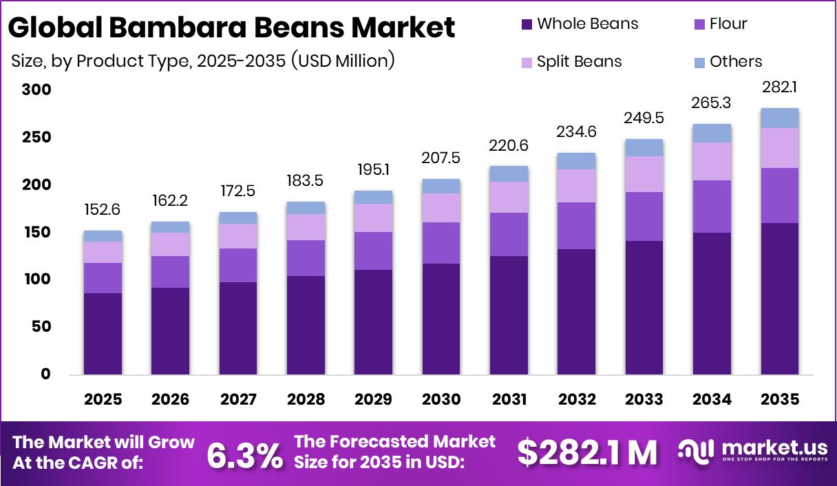- The Global Bambara Beans Market is expected to be worth around USD 282.1 million by 2034, up from USD 152.6 million in 2024, and is projected to grow at a CAGR of 6.3% from 2025 to 2034.