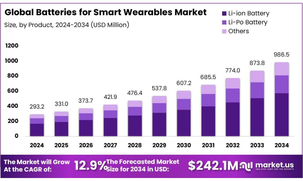 - Batteries for Smart Wearables Market size is expected to be worth around USD 986.5 Million by 2034, from USD 293.2 Million in 2024, growing at a CAGR of 12.9%.