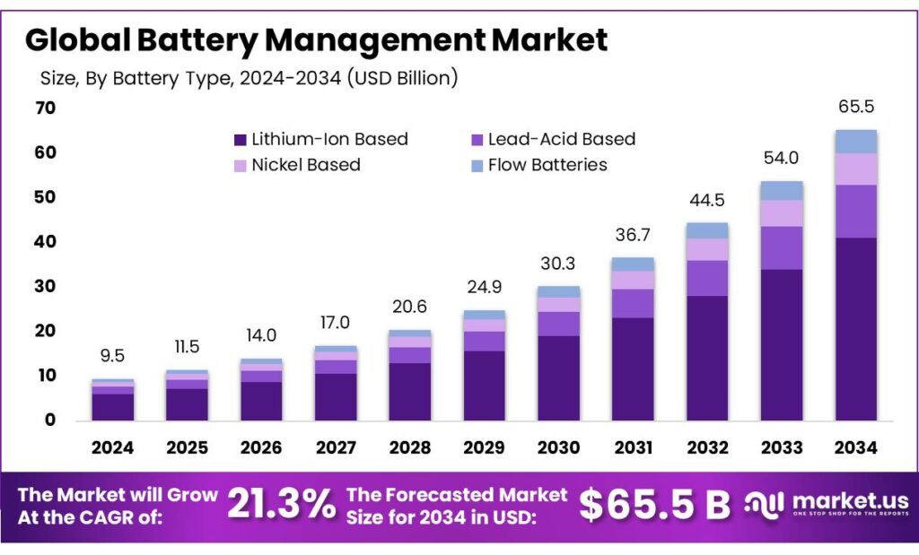 - Battery Management Market size is expected to be worth around USD 65.5 Billion by 2034, from USD 9.5 Billion in 2024, growing at a CAGR of 21.3%.