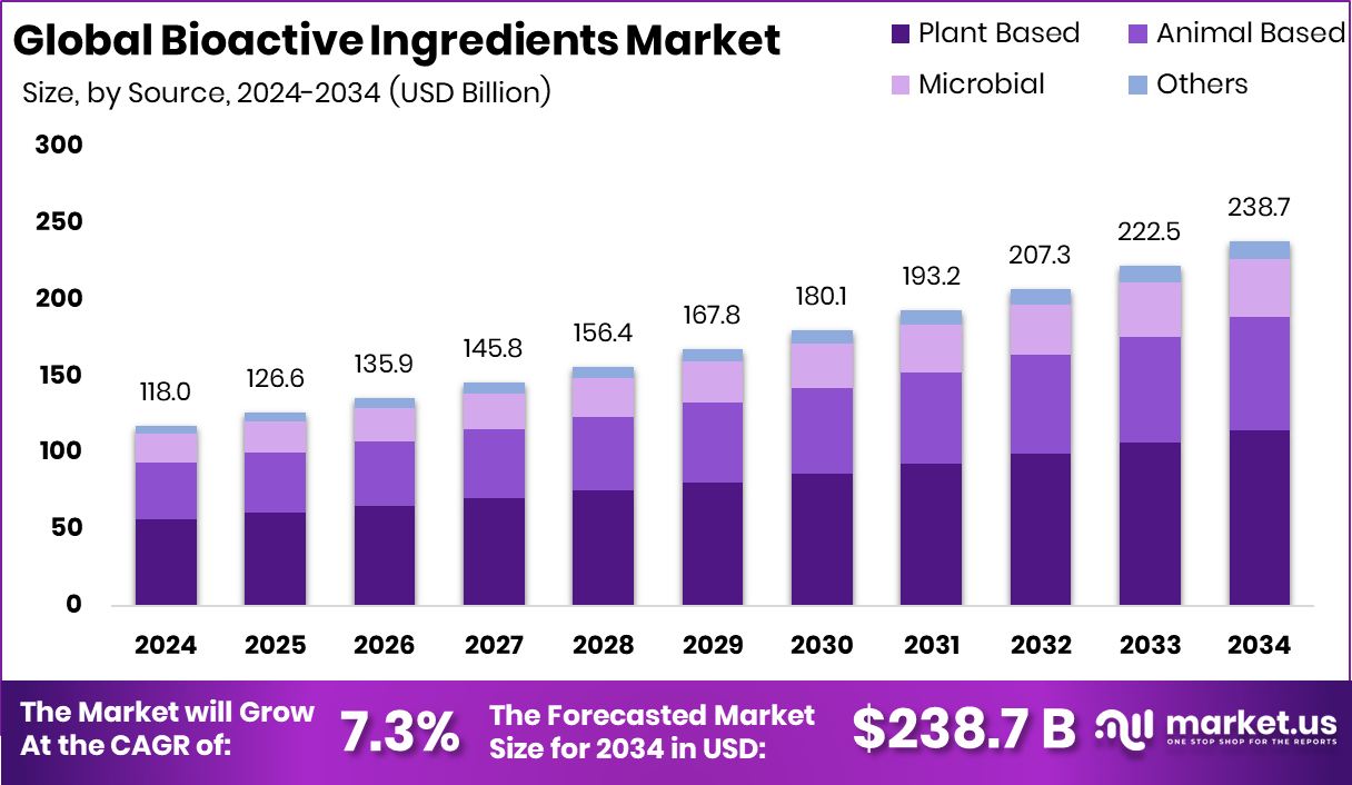 - The Global Bioactive Ingredients Market is expected to be worth around USD 238.7 billion by 2034, up from USD 118.0 billion in 2024, and is projected to grow at a CAGR of 7.3% from 2025 to 2034.
