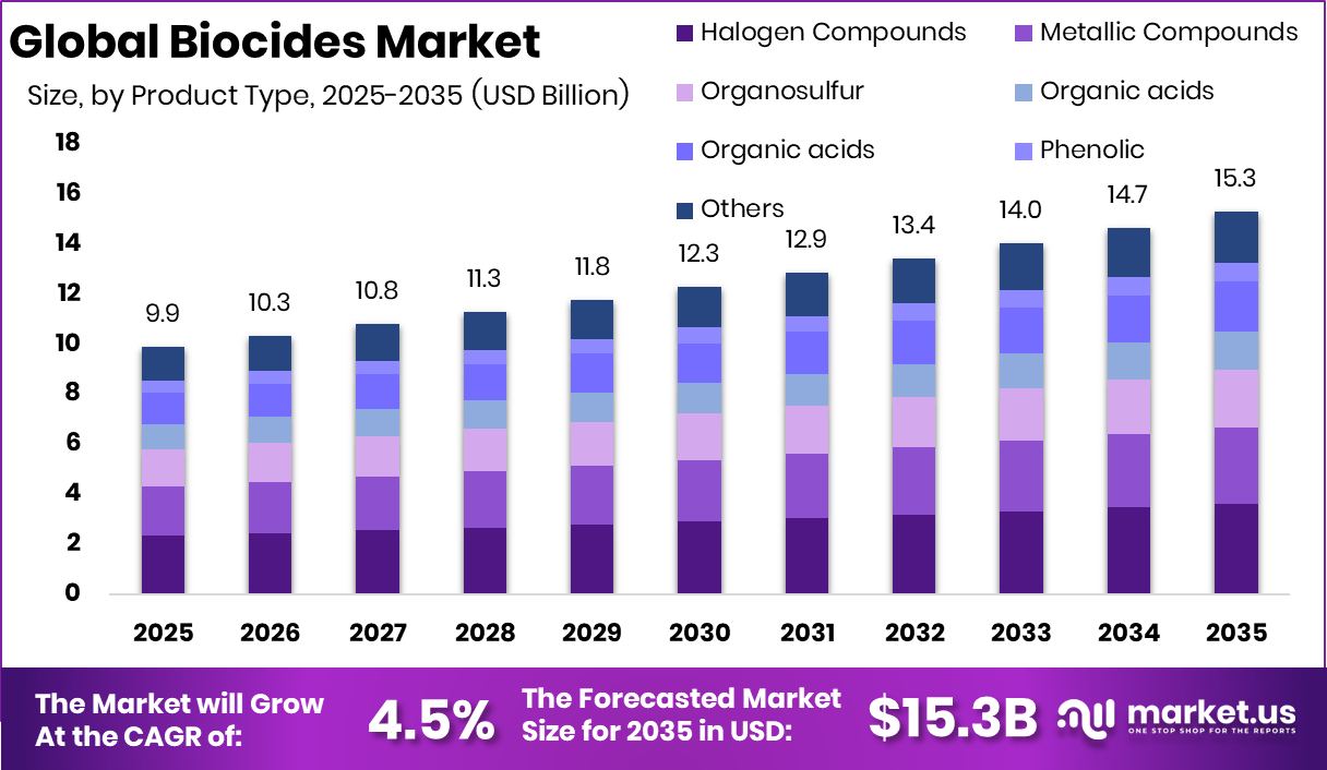 Global Biocides Market Size, Share, And Enhanced Productivity By Product Type (Halogen Compounds, Metallic Compounds, Organosulfur, Organic acids, Quaternary Ammonium Compounds, Phenolic, Nitrogen, Glutaraldehyde), By End Use (Water Treatment, Food and Beverage, Personal Care, Wood Preservation, Paints and Coatings, Oil and Gas, Pulp and Paper, Others), By Region and Companies - Industry Segment Outlook, Market Assessment, Competition Scenario, Trends, and Forecast 2026-2035