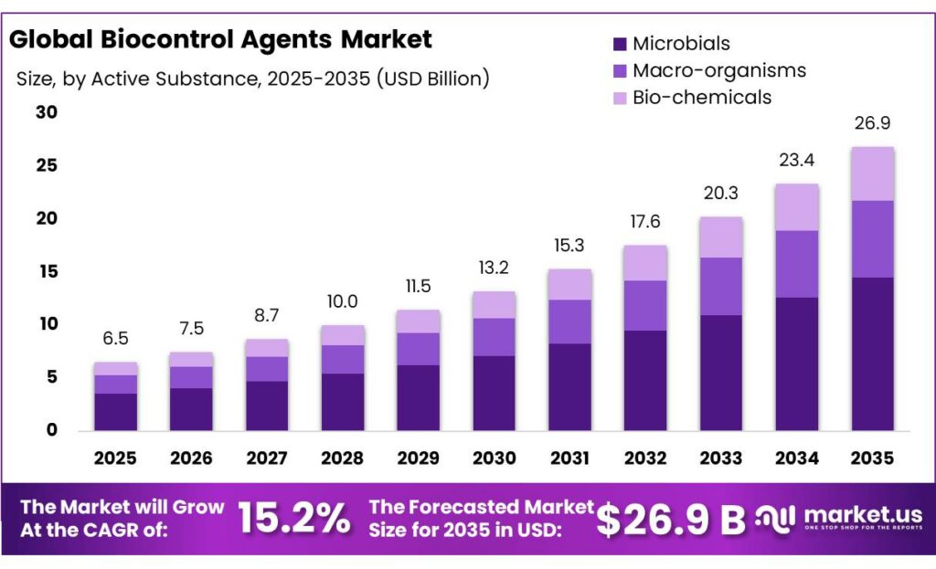- Biocontrol Agents Market size is expected to be worth around USD 26.9 Billion by 2035, from USD 6.5 Billion in 2025, growing at a CAGR of 15.2%.