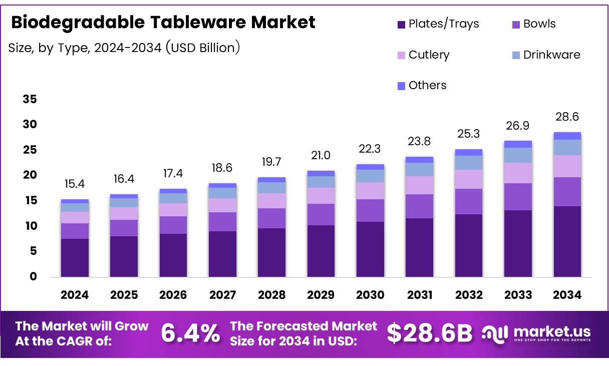 The Global Biodegradable Tableware Market size is expected to be worth around USD 28.6 Billion by 2034, from USD 15.4 Billion in 2024, growing at a CAGR of 6.4% during the forecast period from 2025 to 2034.