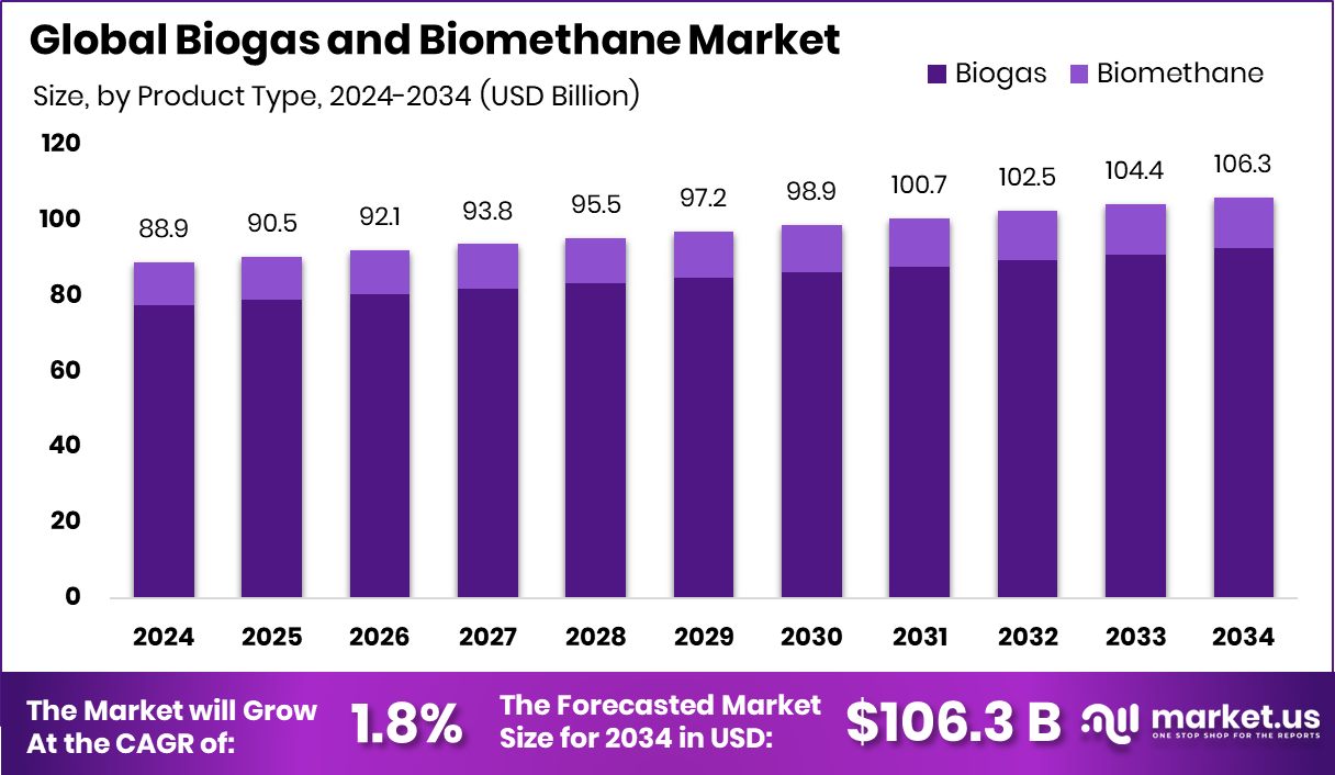 - Global Biogas and Biomethane Market is expected to be worth around USD 106.3 billion by 2034, up from USD 88.9 billion in 2024, and grow at a CAGR of 1.8% from 2025 to 2034.