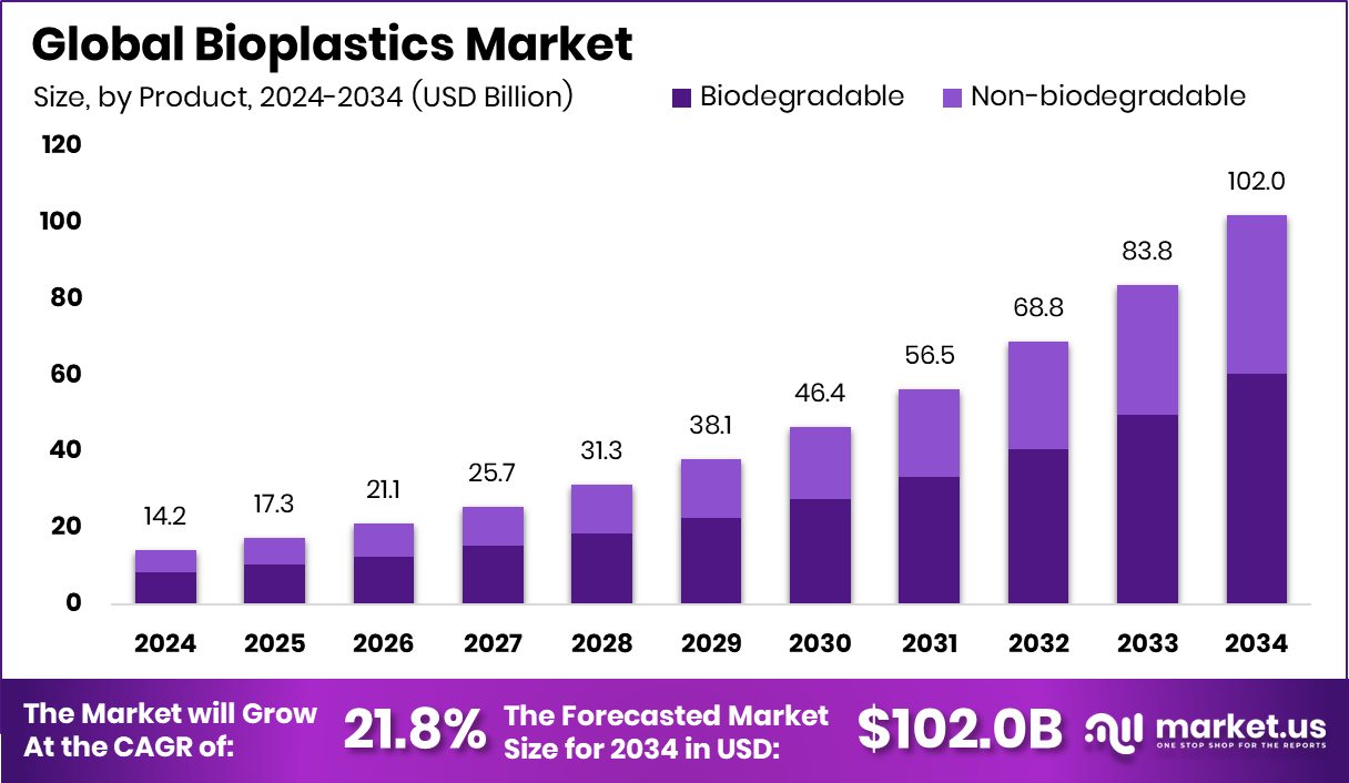 - The Global Bioplastics Market is expected to be worth around USD 102.0 billion by 2034, up from USD 14.2 billion in 2024, and is projected to grow at a CAGR of 21.8% from 2025 to 2034.