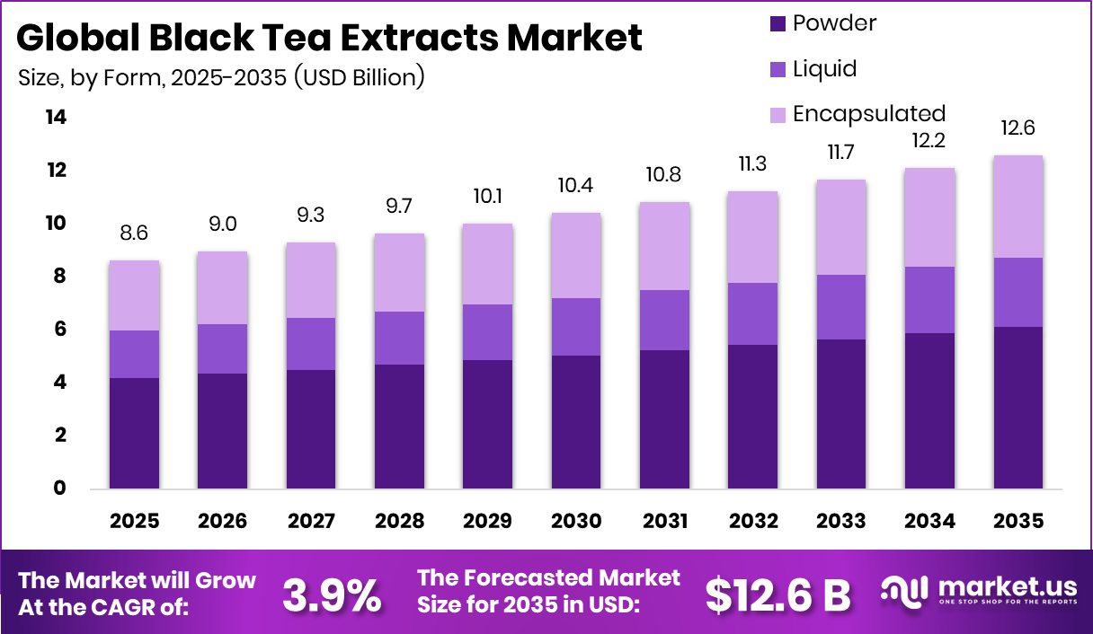 - The Global Black Tea Extracts Market is expected to be worth around USD 12.6 billion by 2035, up from USD 8.6 billion in 2025. It is projected to grow at a CAGR of 3.9% from 2026 to 2035.