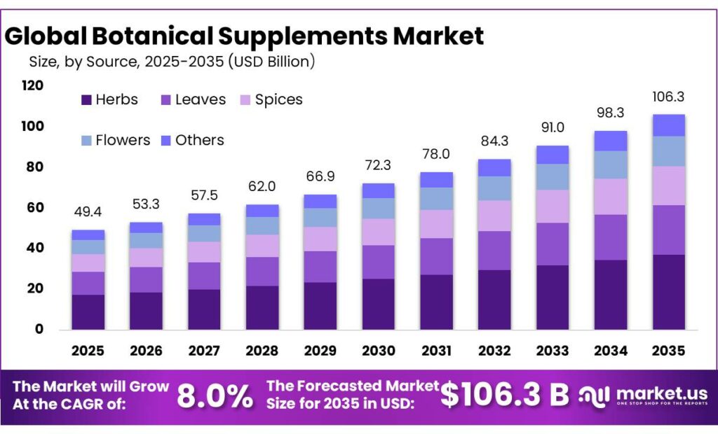 - Botanical Supplements Market size is expected to be worth around USD 106.3 Billion by 2035, from USD 49.4 Billion in 2025, growing at a CAGR of 8.0%.
