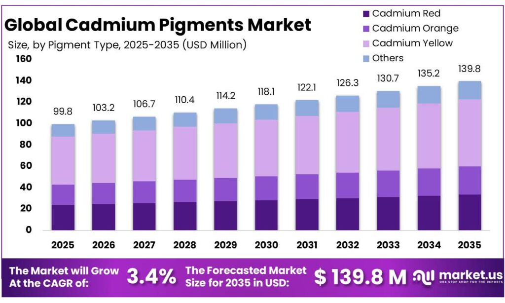 - Cadmium Pigments Market size is expected to be worth around USD 139.8 Million by 2035, from USD 99.8 Million in 2025, growing at a CAGR of 3.4%.