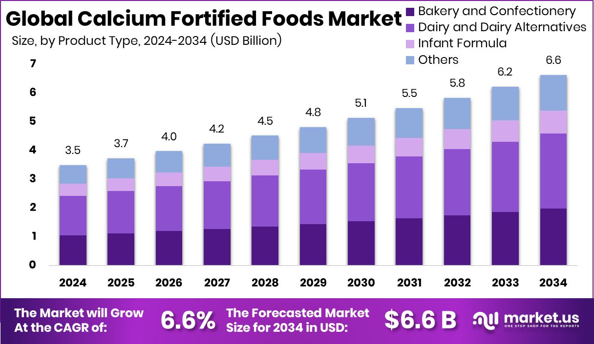 - The Global Calcium Fortified Foods Market is expected to be worth around USD 6.6 billion by 2034, up from USD 3.5 billion in 2024, and is projected to grow at a CAGR of 6.6% from 2025 to 2034.