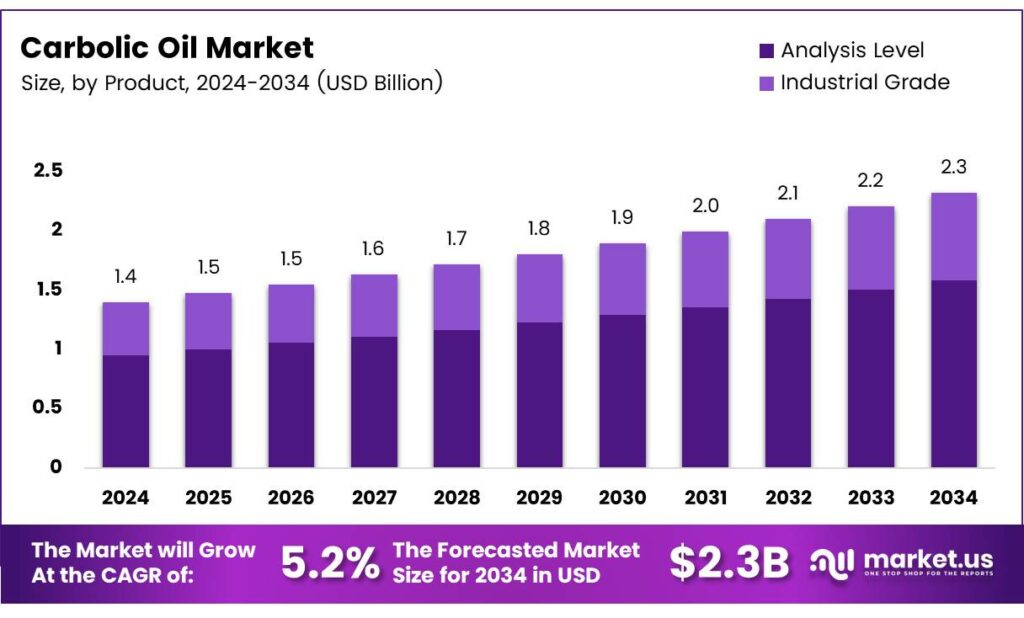 - The Global Carbolic Oil Market is projected to grow from USD 1.4 billion in 2024 to USD 2.3 billion by 2034, registering a 5.2% CAGR during 2025–2034.