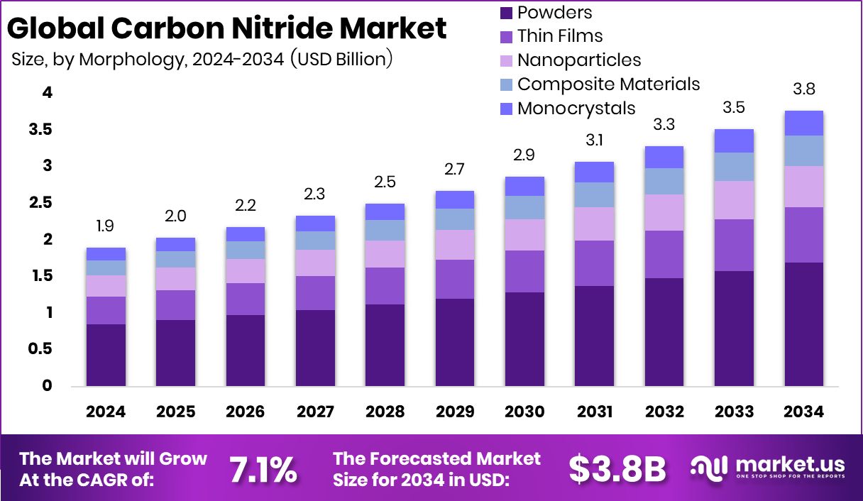 - The Global Carbon Nitride Market is expected to be worth around USD 3.8 billion by 2034, up from USD 1.9 billion in 2024, and is projected to grow at a CAGR of 7.1% from 2025 to 2034.
