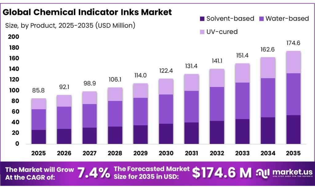 - Chemical Indicator Inks Market size is expected to be worth around USD 174.6 Million by 2035, from USD 85.8 Million in 2025, growing at a CAGR of 7.4%.