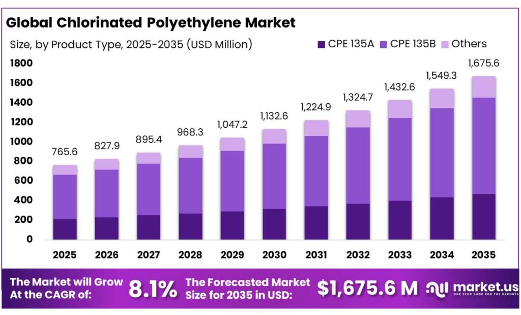 - Chlorinated Polyethylene Market size is expected to be worth around USD 1,675.6 Million by 2035, from USD 765.6 Million in 2025, growing at a CAGR of 8.1%.