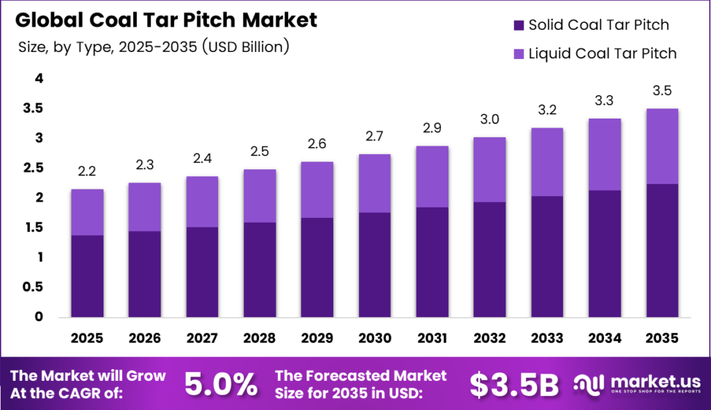 The Global Coal Tar Pitch Market size is expected to be worth around USD 3.5 billion by 2035 from USD 2.2 billion in 2025, growing at a CAGR of 5.0% during the forecast period 2026 to 2035.