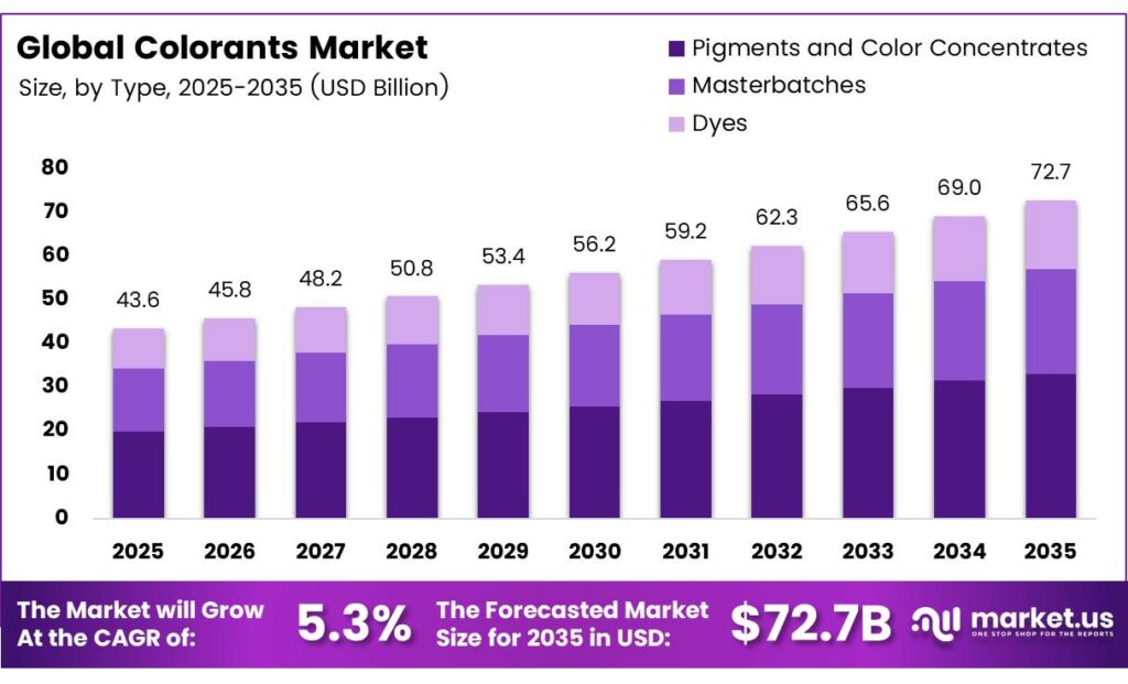 The Global Colorants Market size is expected to be worth around USD 72.7 billion by 2035 from USD 43.5 billion in 2025, growing at a CAGR of 5.3% during the forecast period 2026 to 2035.