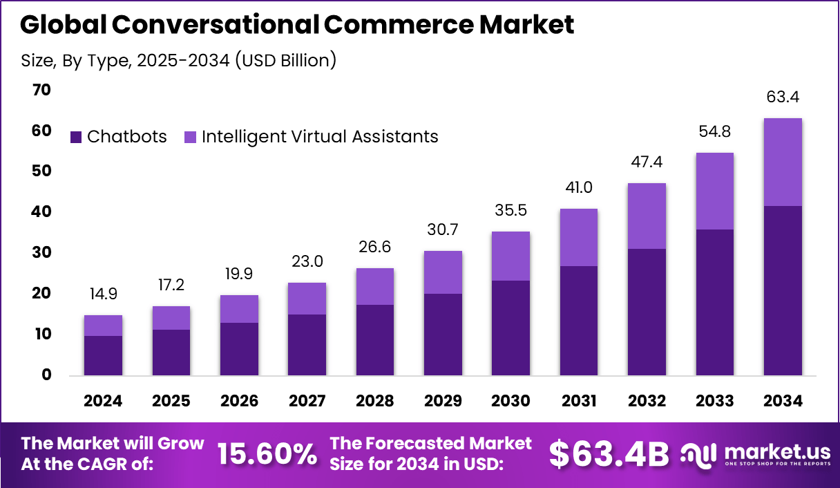 - By type, chatbots accounted for 65.8% of the conversational commerce market, as they handle customer queries and sales through natural chat.