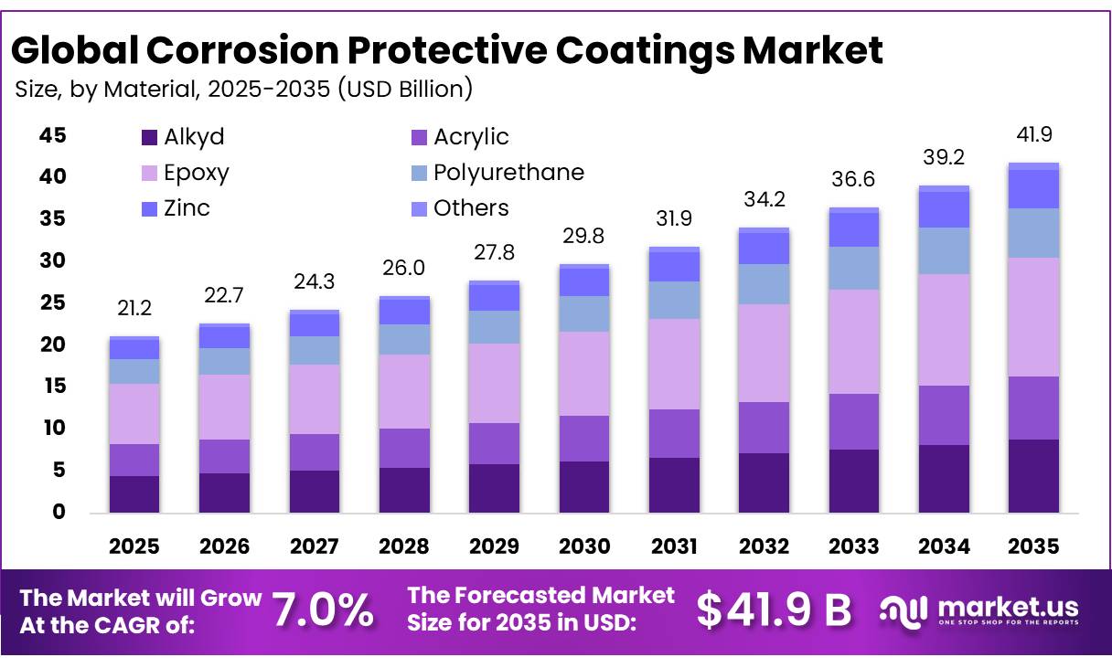 - Corrosion Protective Coatings Market size is expected to be worth around USD 41.9 Billion by 2035, from USD 21.2 Billion in 2025, growing at a CAGR of 7.0%.
