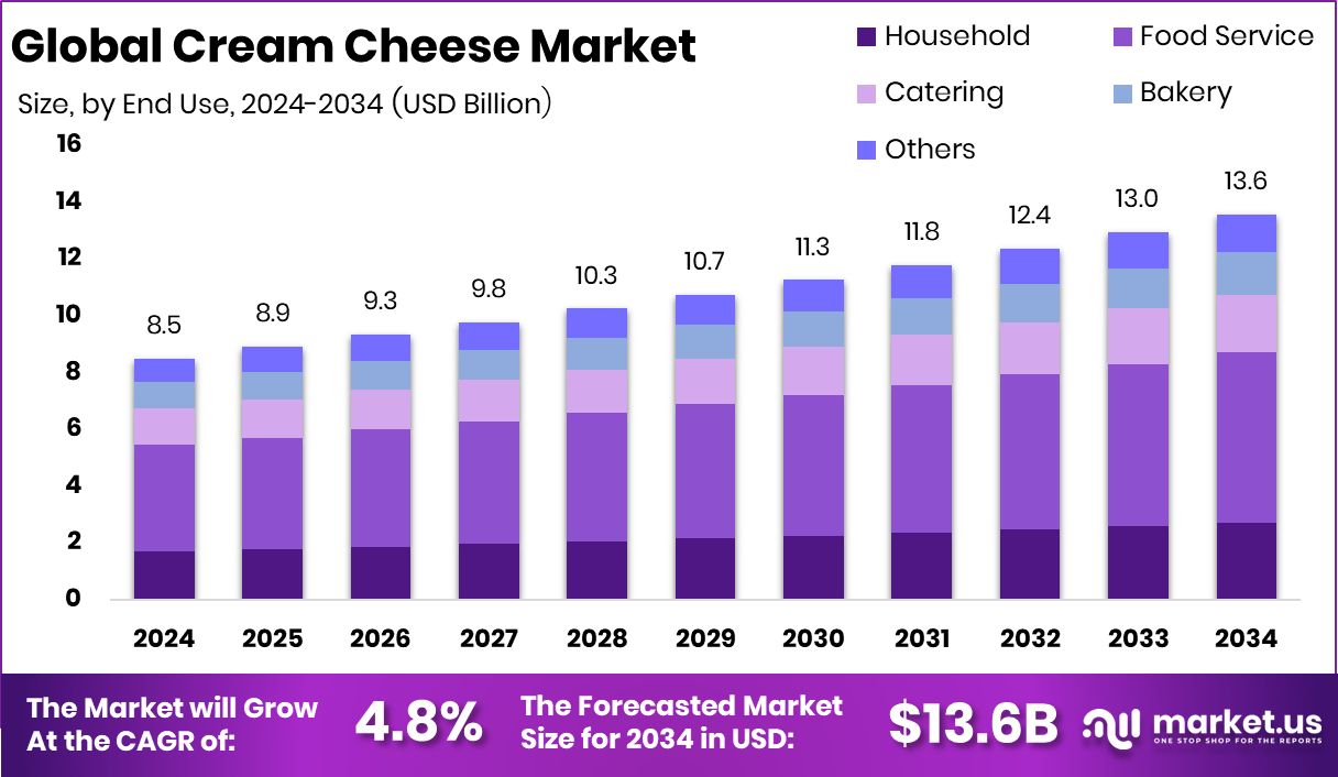 - The Global Cream Cheese Market is expected to be worth around USD 13.6 billion by 2034, up from USD 8.5 billion in 2024, and is projected to grow at a CAGR of 4.8% from 2025 to 2034.