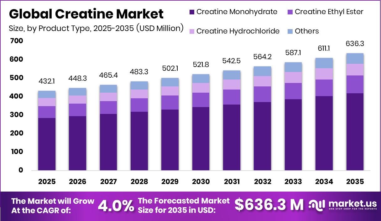 - The Global Creatine Market is expected to be worth around USD 636.3 million by 2034, up from USD 432.1 million in 2024. It is projected to grow at a CAGR of 4.0% from 2025 to 2034.