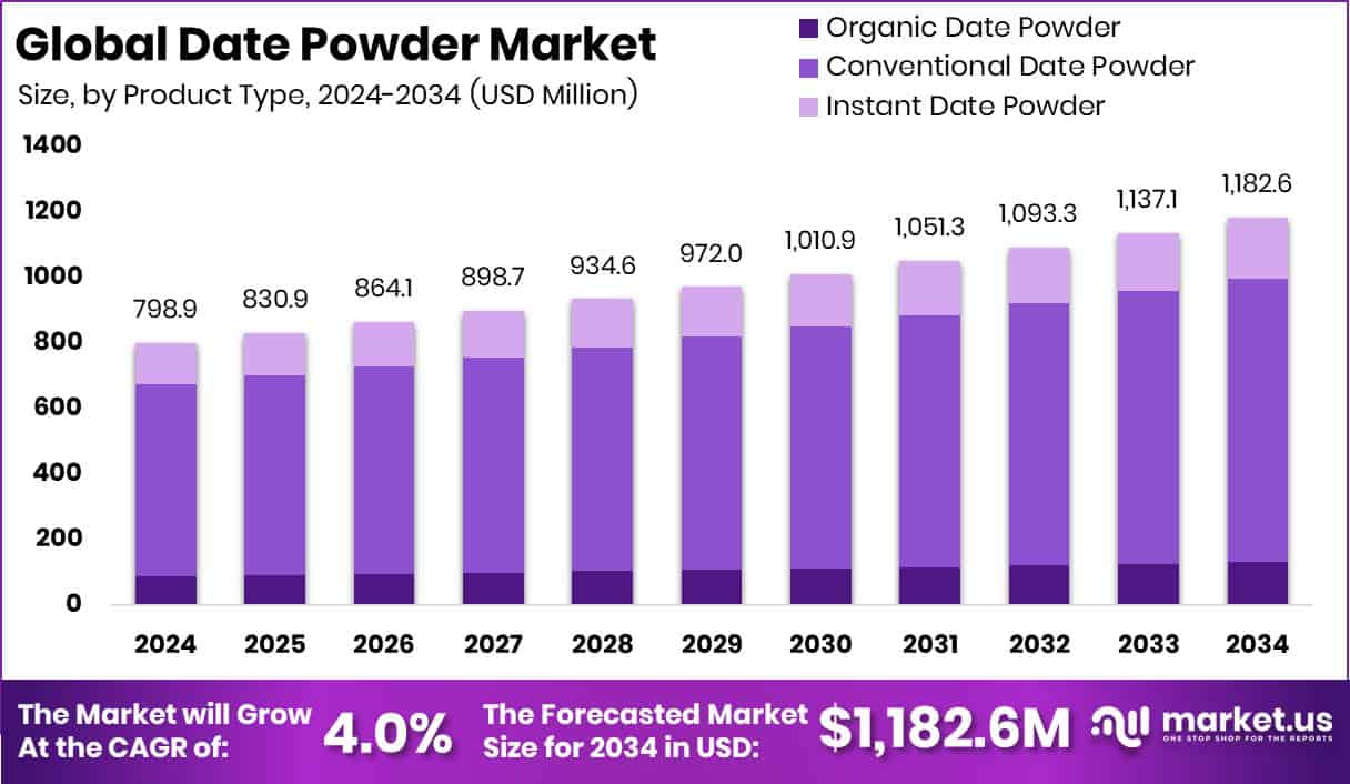 - The Global Date Powder Market is expected to be worth around USD 1,182.6 million by 2034, up from USD 798.9 million in 2024, and is projected to grow at a CAGR of 4.0% from 2025 to 2034.