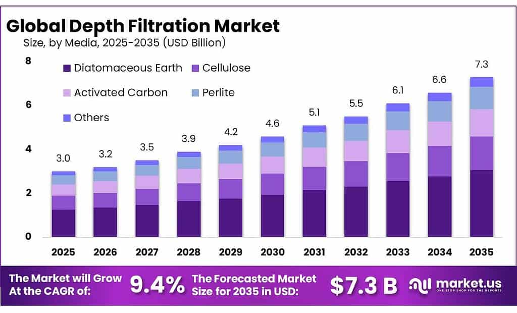 - Depth Filtration Market size is expected to be worth around USD 7.3 Billion by 2035, from USD 3.0 Billion in 2025, growing at a CAGR of 9.4%.