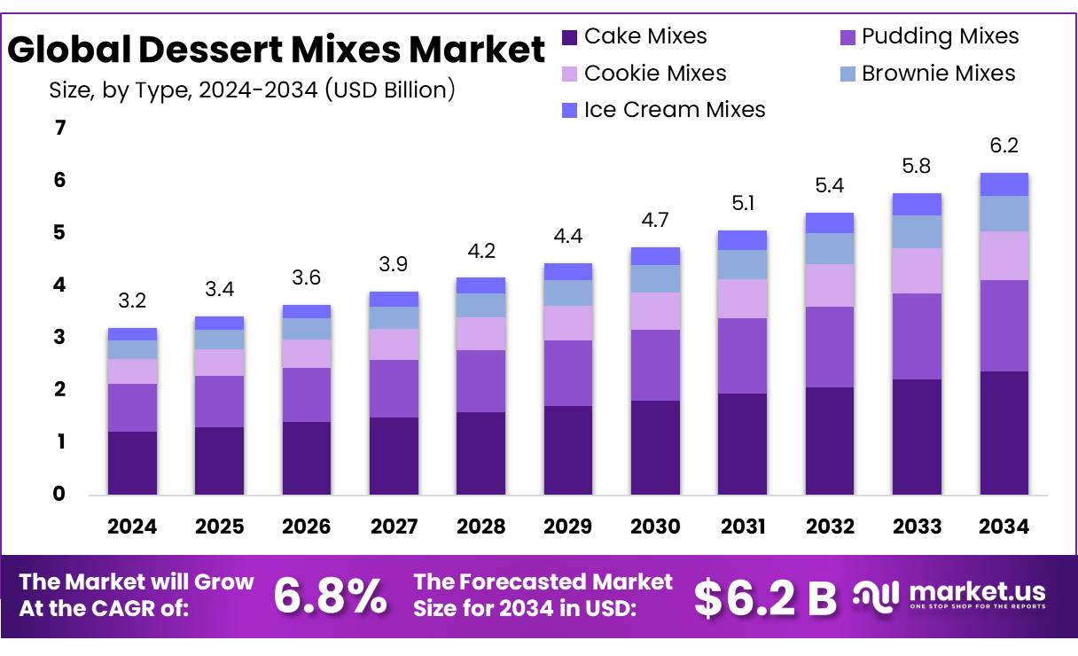 - Dessert Mixes Market size is expected to be worth around USD 6.2 Billion by 2034, from USD 3.2 Billion in 2024, growing at a CAGR of 6.8%.