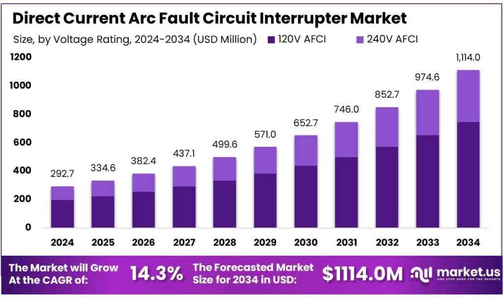 - Direct Current Arc Fault Circuit Interrupter Market size is expected to be worth around USD 1114.0 Million by 2034, from USD 292.7 Million in 2024, growing at a CAGR of 14.3%.
