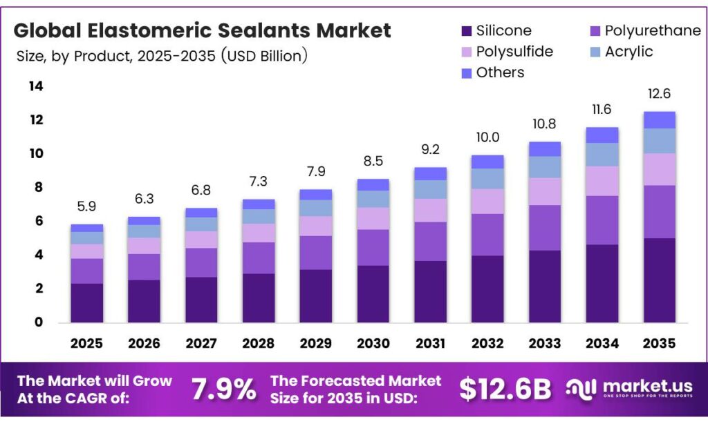 The Global Elastomeric Sealants Market size is expected to be worth around USD 12.6 billion by 2035 from USD 5.9 billion in 2025, growing at a CAGR of 7.9% during the forecast period 2026 to 2035.