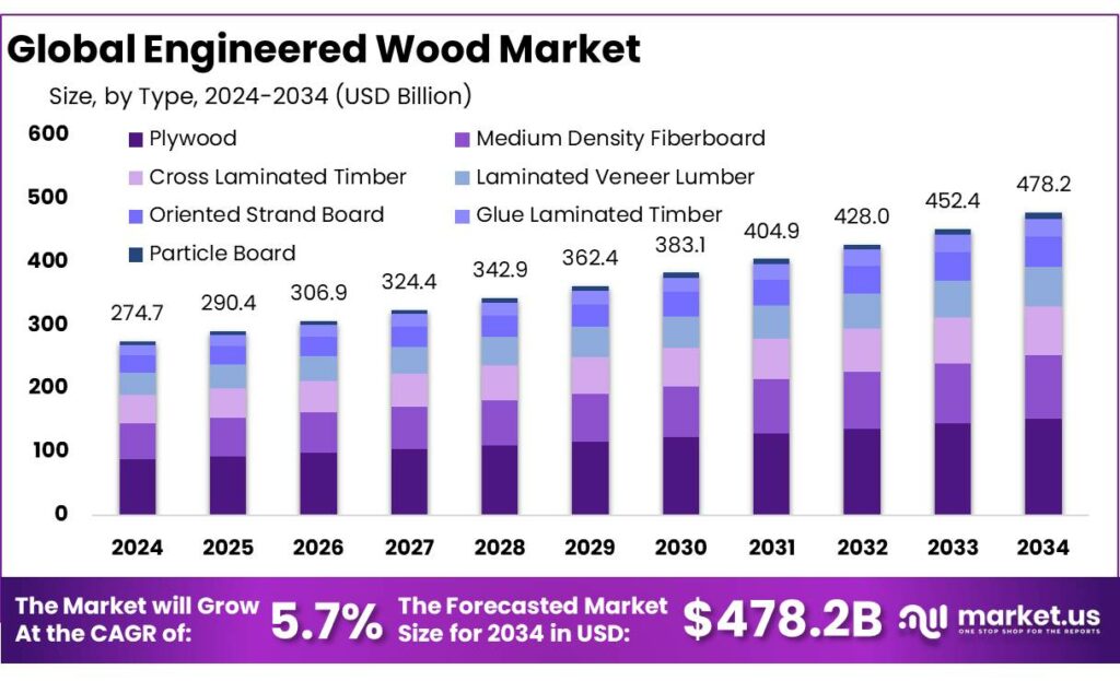 - Engineered Wood Market size is expected to be worth around USD 478.2 Billion by 2034, from USD 274.7 Billion in 2024, growing at a CAGR of 5.7%.