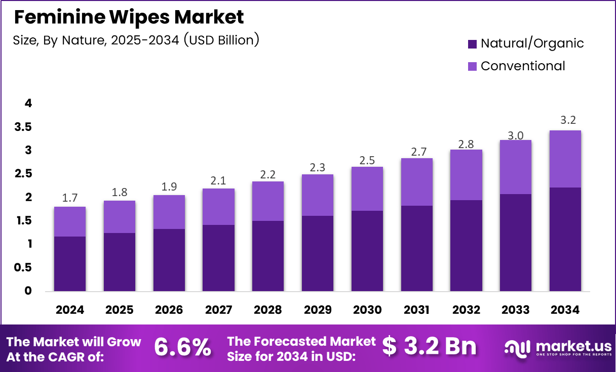 The Global Feminine Wipes Market size is expected to be worth around USD 3.2 billion by 2034, from USD 1.7 billion in 2024, growing at a CAGR of 6.6% during the forecast period from 2025 to 2034.
