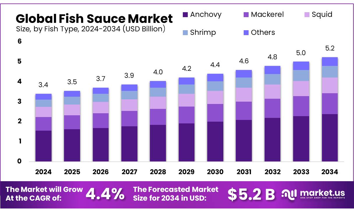 The Global Fish Sauce Market size is expected to be worth around USD 5.2 Billion by 2034, from USD 3.4 Billion in 2024, growing at a CAGR of 4.4% during the forecast period from 2025 to 2034.