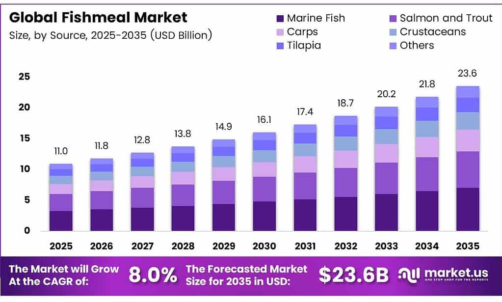 The Global Fishmeal Market size is expected to reach around USD 23.6 billion by 2035, up from USD 11.0 billion in 2025, growing at a CAGR of 8.0% over the forecast period 2026 to 2035.