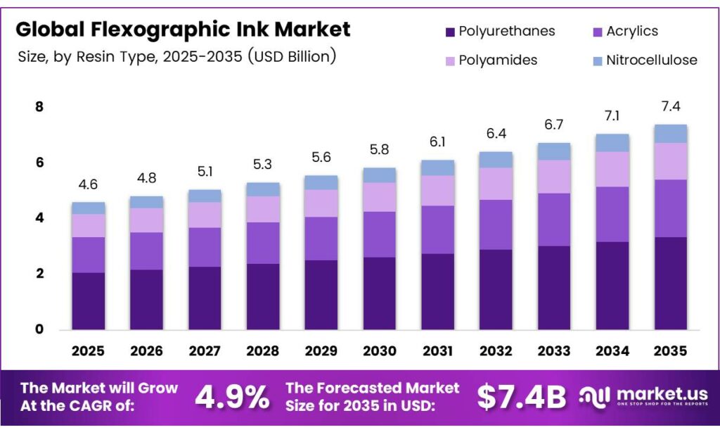The Global Flexographic Ink Market size is expected to be worth around USD 7.4 billion by 2035 from USD 4.6 billion in 2025, growing at a CAGR of 4.9% during the forecast period 2026 to 2035.