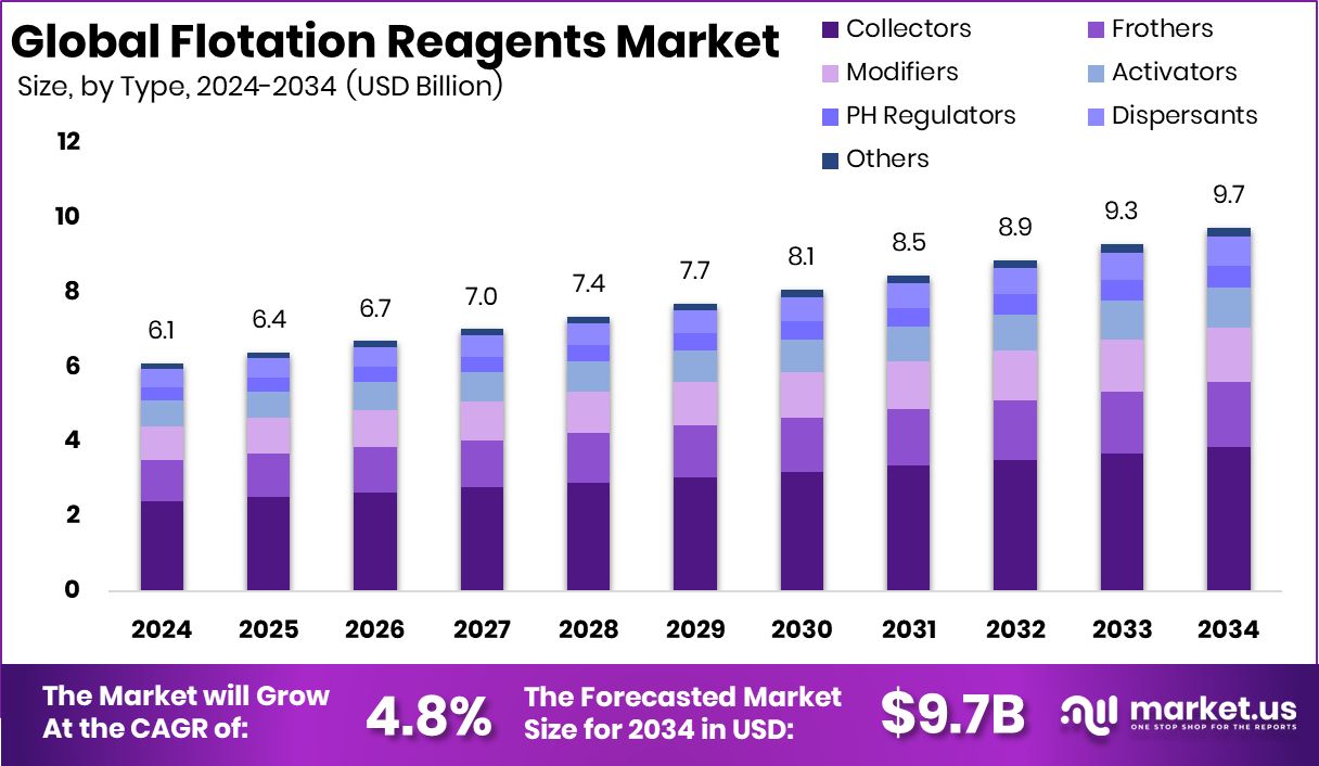 - The Global Flotation Reagents Market is expected to be worth around USD 9.7 billion by 2034, up from USD 6.1 billion in 2024, and is projected to grow at a CAGR of 4.8% from 2025 to 2034.