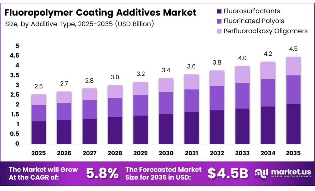 - The Global Fluoropolymer Coating Additives Market is valued at USD 2.5 billion in 2025 and is forecast to reach USD 4.5 billion by 2035 at a CAGR of 5.8% during the forecast period 2026 to 2035.