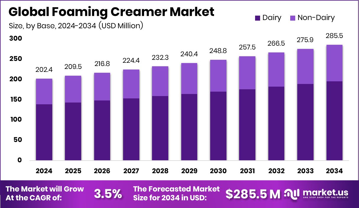 - Global Foaming Creamer Market is expected to be worth around USD 285.5 Million by 2034, up from USD 202.4 Million in 2024, and grow at a CAGR of 3.5% from 2025 to 2034.