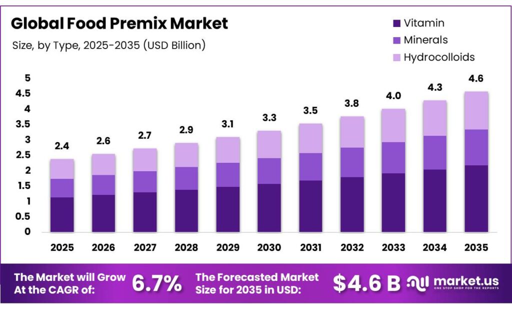 - The global food premix market was valued at USD 2.4 billion in 2024.