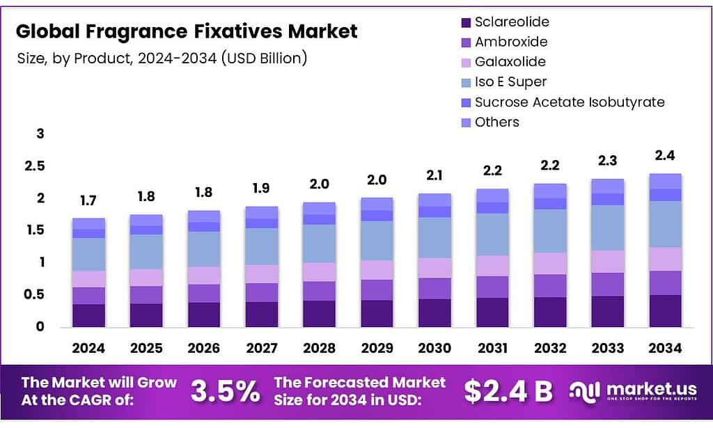 - The global fragrance fixatives market is projected to grow at a CAGR of 3.5% and is estimated to reach USD 2.4 billion by 2034.