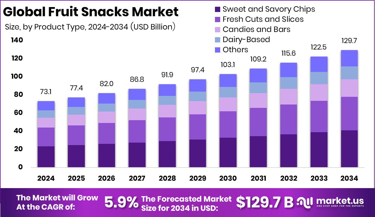 - The Global Fruit Snacks Market is expected to be worth around USD 129.7 billion by 2034, up from USD 73.1 billion in 2024, and is projected to grow at a CAGR of 5.9% from 2025 to 2034.
