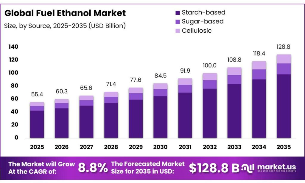 The conversion of starch to fermentable sugars involves a straightforward enzymatic hydrolysis process, which is well understood and industrially scalable, reducing operational complexity and cost. In contrast, sugar-based ethanol, derived from crops such as sugarcane, is geographically constrained to regions with suitable climates, limiting global applicability.