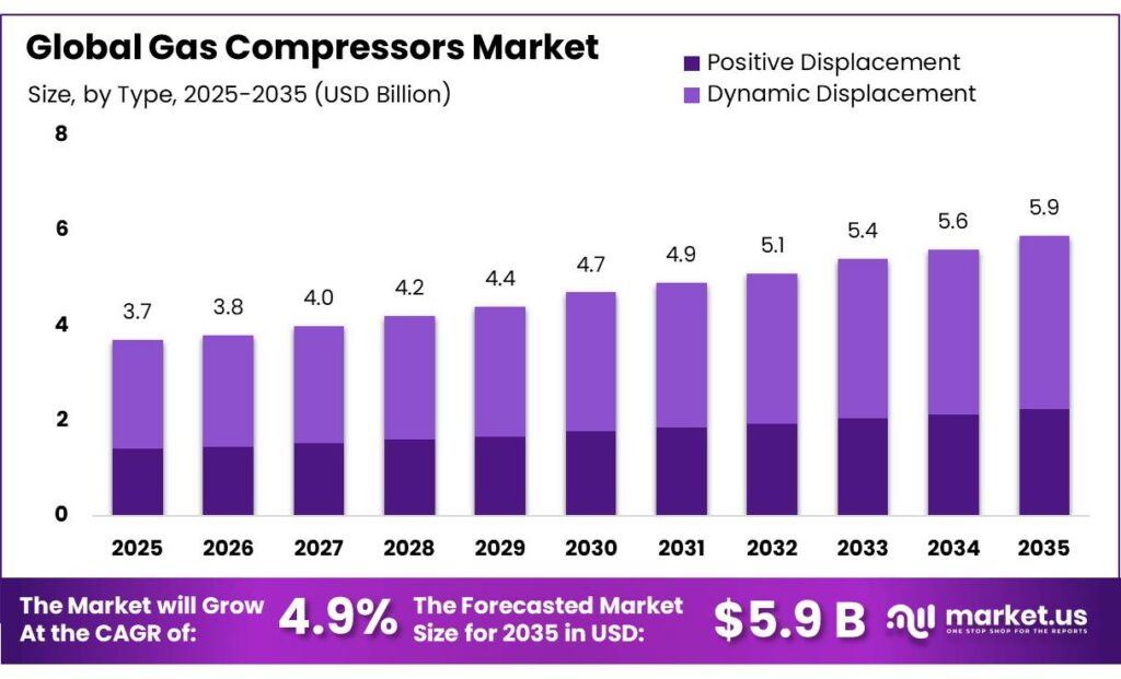 - Gas Compressors Market size is expected to be worth around USD 5.9 Billion by 2035, from USD 3.7 Billion in 2025, growing at a CAGR of 4.9%.