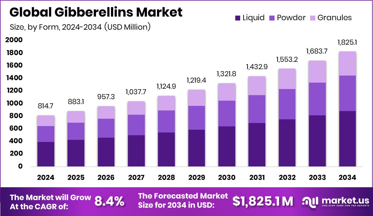 - The Global Gibberellins Market is expected to be worth around USD 1,825.1 million by 2034, up from USD 814.7 million in 2024, and is projected to grow at a CAGR of 8.4% from 2025 to 2034.