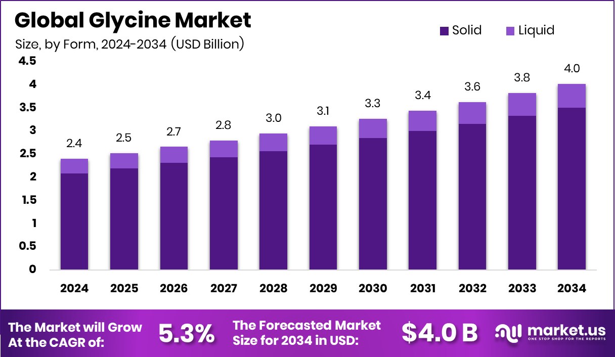 - Global Glycine Market is expected to be worth around USD 4.0 billion by 2034, up from USD 2.4 billion in 2024, and grow at a CAGR of 5.3% from 2025 to 2034.