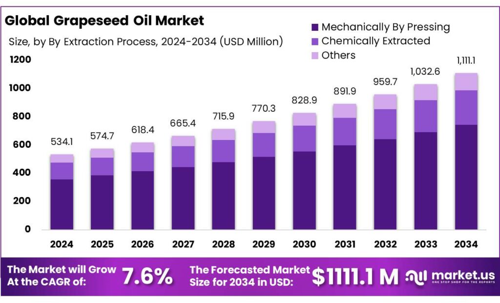 - Grapeseed Oil Market size is expected to be worth around USD 1111.1 Million by 2034, from USD 532.1 Million in 2024, growing at a CAGR of 7.6%.