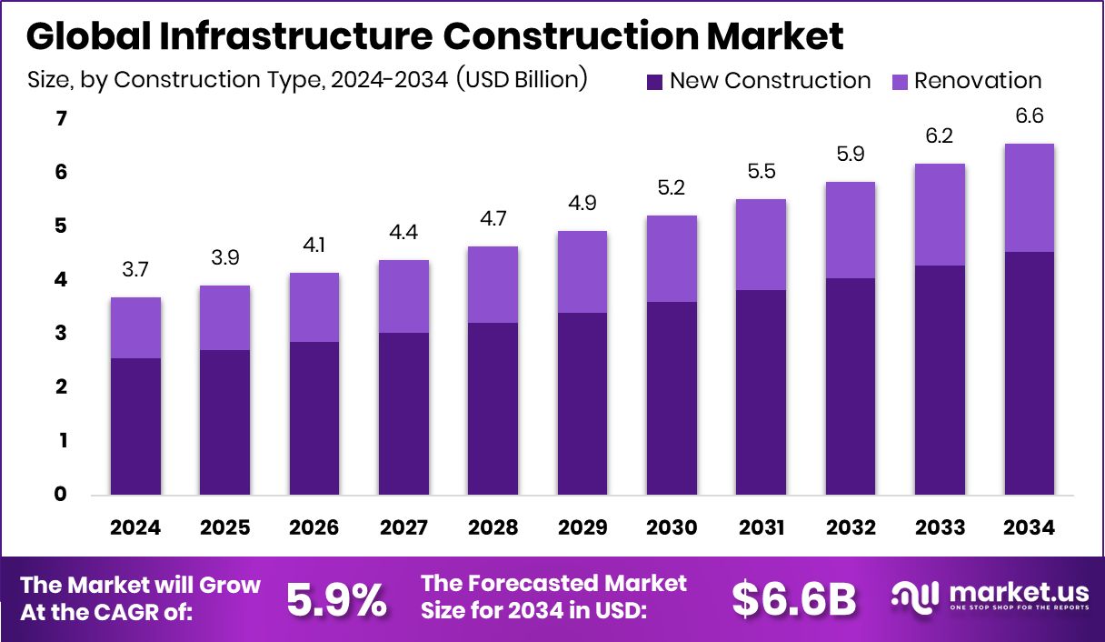 - The Global Infrastructure Construction Market is expected to be worth around USD 6.6 billion by 2034, up from USD 3.7 billion in 2024, and is projected to grow at a CAGR of 5.9% from 2025 to 2034.