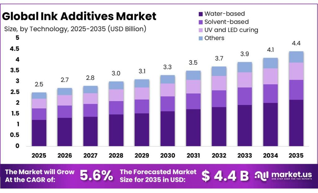 - Ink Additives Market size is expected to be worth around USD 4.4 Billion by 2035, from USD 2.5 Billion in 2025, growing at a CAGR of 5.6%.