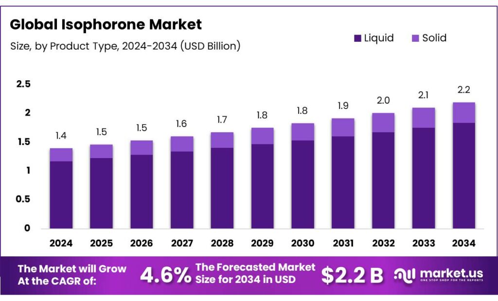 - Isophorone Market size is expected to be worth around USD 2.2 Billion by 2034, from USD 1.4 Billion in 2024, growing at a CAGR of 4.6%.