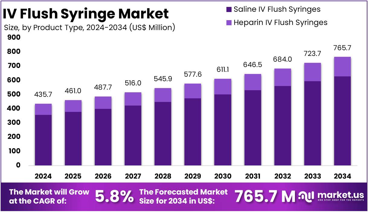 - In 2024, the market for IV Flush Syringe generated a revenue of US$ 435.7 million, with a CAGR of 5.8%, and is expected to reach US$ 765.7 million by the year 2034.